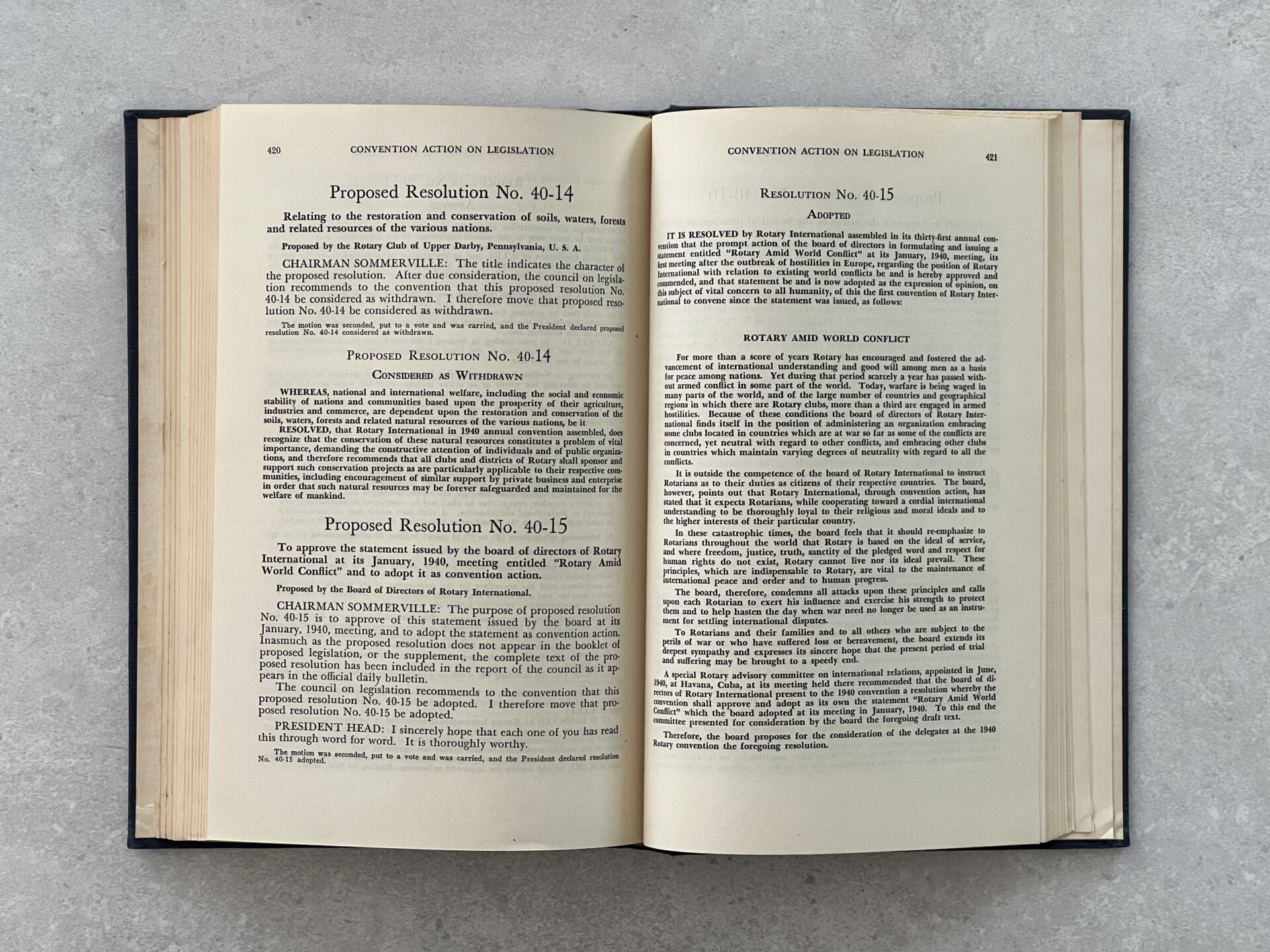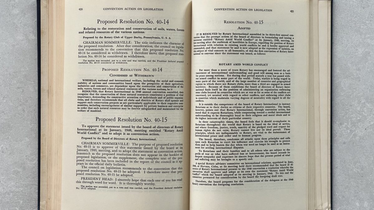 Au cœur de cette convention hors du commun naît la célèbre Résolution 40-15, « Rotary amid world conflict ». Évoquant la guerre qui sévit déjà dans un tiers des pays où le Rotary International est implanté, le Conseil d’Administration y rappelle que l’organisation, fondée sur l’idéal de service, “ne peut survivre là où la liberté, la justice, la vérité, la valeur de la parole donnée et le respect des droits de l’homme n’existent pas“. C’est cet extrait que l’on trouve le plus souvent mentionné quand on se documente sur l’origine de la Déclaration Universelle des Droits de l’Homme.