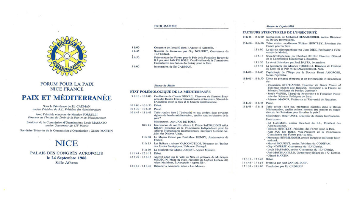 Ainsi à Nice en septembre 1988 «le forum pour la paix « « paix en Méditerranée » rassembla 2 200 participants et à Lille en octobre 2022 la conférence « le long chemin de la paix » 1 200 participants.